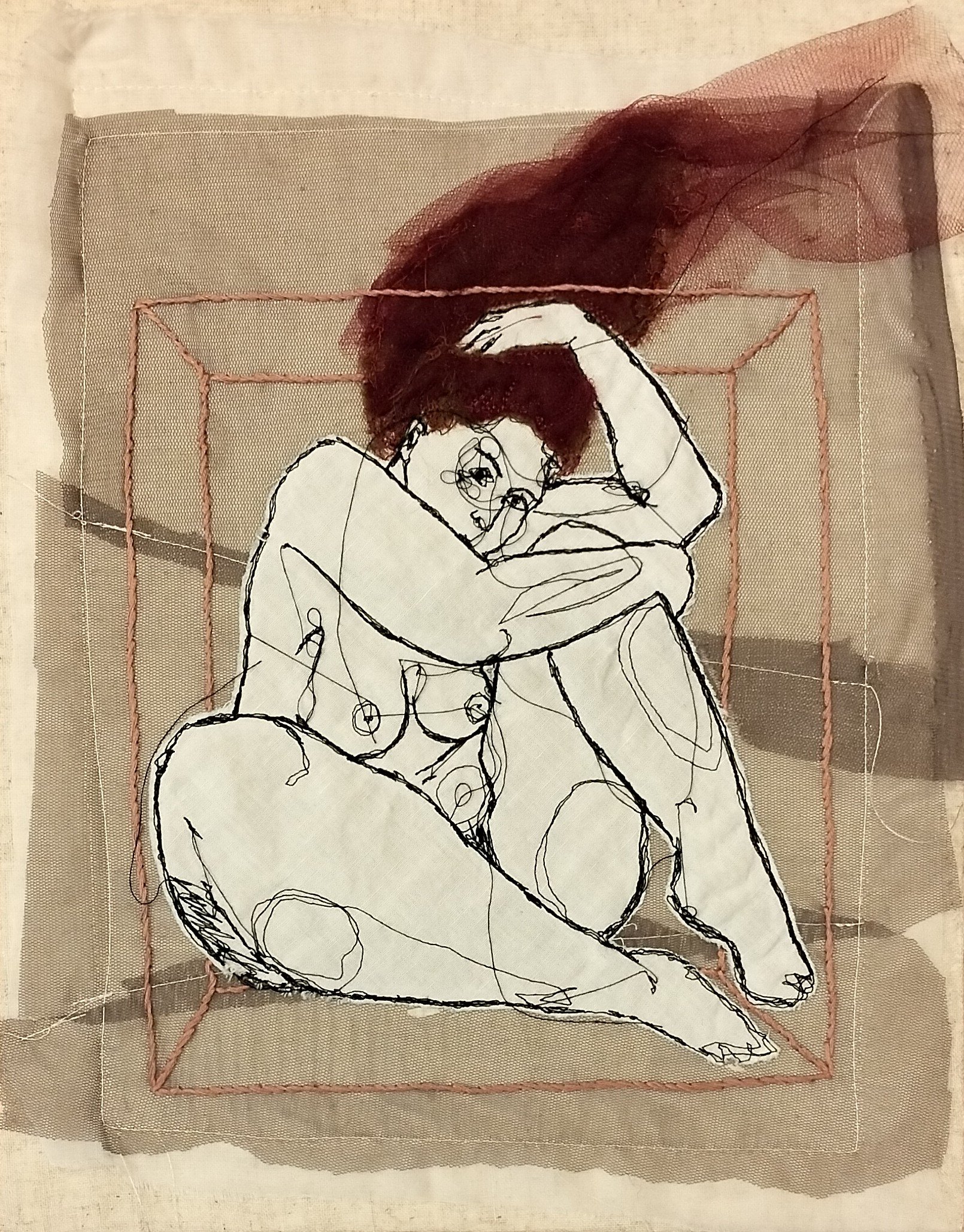 A female figure is enclosed within a stitched cage that both defines and restricts her space. The thread acts as a boundary, fragile yet insistent.