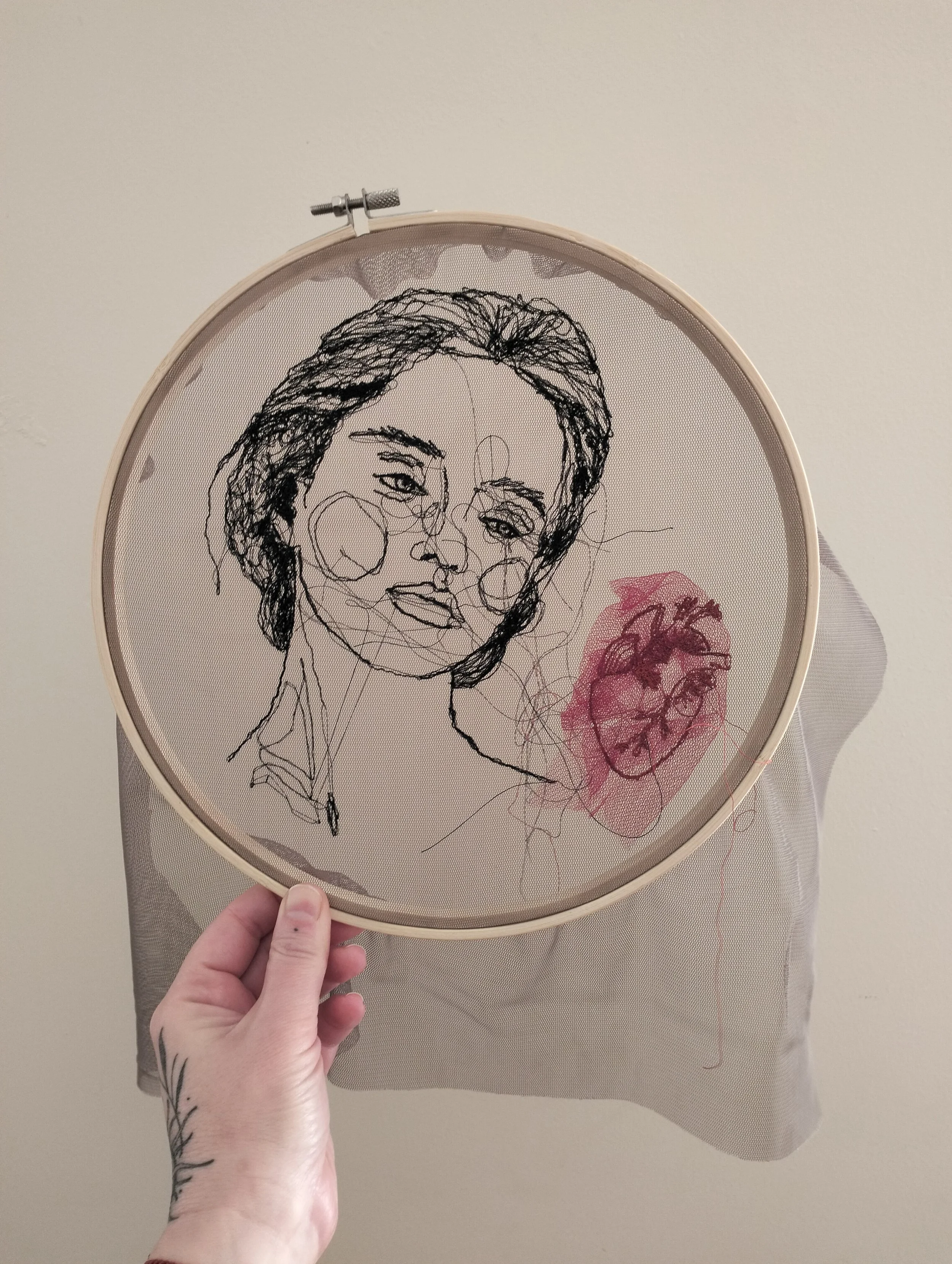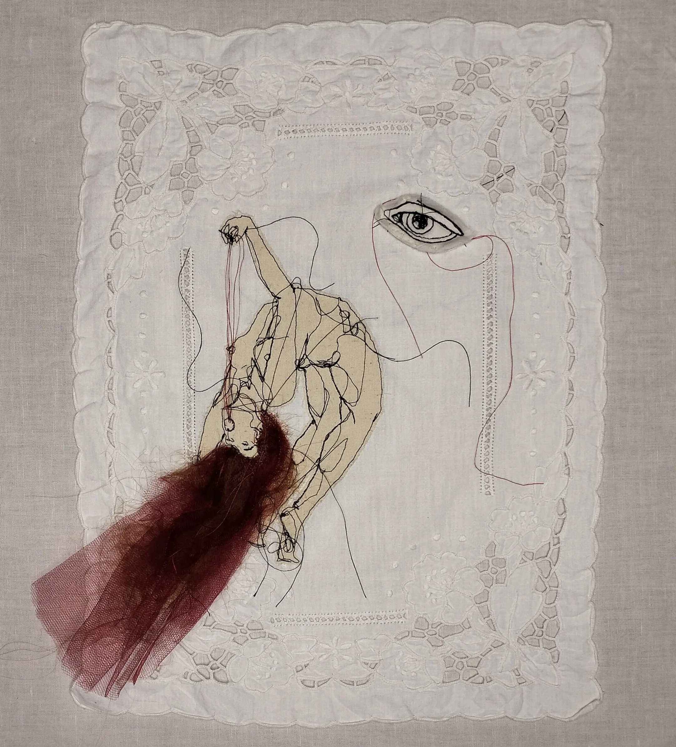 Working with fabric, thread, hand and machine embroidery, beading and layered surfaces, I treat cloth as a living skin, as something that can hold traces of touch, time and personal history. The process is slow, tactile and intuitive, allowing the work to grow organically rather than through pre-planned compositions.
